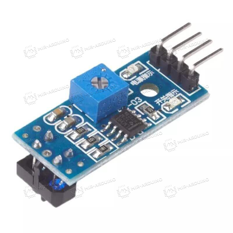 Датчик линии TCRT5000 – оптический модуль, который может находить препятствия в виде черных и белых линий. Работает от оптопары TCRT5000. Она включает в себя фототранзистор и светодиод, которые разделены перегородкой для предотвращения взаимного влияния друг на друга. Предусмотрены компаратор, светодиодный индикатор и подстроечный резистор, с помощью которого можно настроить нужную чувствительность. Датчик подключается к платформе Ардуино с помощью трех контактов – земля, питание и соединение с контроллером. Применяется в проектах, где требуется ориентация роботов в пространстве.